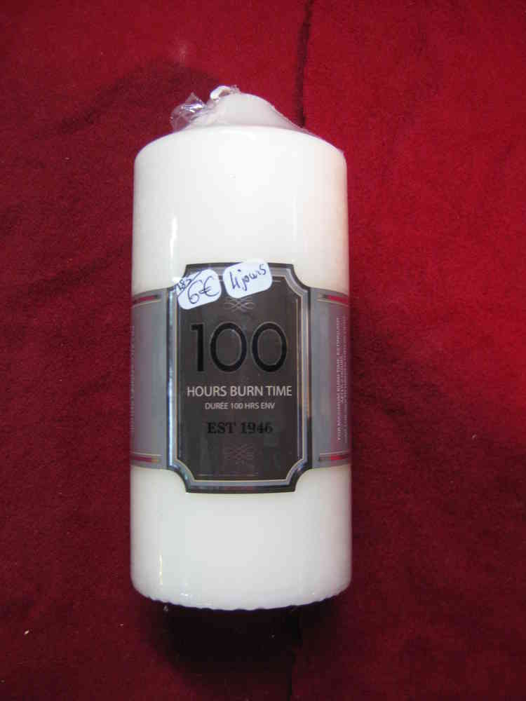 Bougie blanche de 100h 4 jours, de très bonne qualité ne coule pas (7cm de diamètre et 16cm de hauteur).
