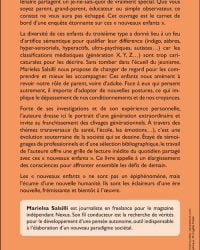 Chaque enfant est unique. Pour autant, ceux du troisième millénaire partagent un je-ne-sais-quoi de vraiment spécial. Que vous soyez parent, grand-parent, éducateur ou simple observateur, ce constat ne vous aura pas échappé. Cet ouvrage est le carnet de bord d’une enquête étonnante sur les « nouveaux enfants ». Sans tomber dans l’écueil du jeunisme, Marielsa Salsilli nous propose de changer de regard pour comprendre ces enfants et mieux les accompagner. Car ils nous amènent à revoir notre rôle de parent, voire d’adulte. À travers des thèmes transversaux (la santé, l’école, les émotions…), c’est une évolution souterraine de la société qui se dessine. Forte de ses investigations et de son expérience personnelle, l’auteur dresse le portrait d’une génération extraordinaire. Son travail offre une lecture inédite du quotidien partagé avec ces « nouveaux enfants » et appelle à l’élargissement des consciences pour affronter ensemble les défis de demain.