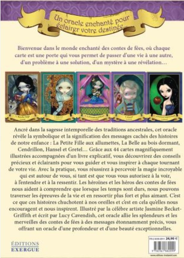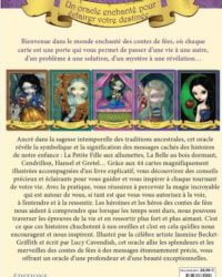 Ancré dans la sagesse intemporelle des traditions ancestrales, cet oracle révèle la symbolique et la signification des messages cachés des histoires de notre enfance : La Petite Fille aux allumettes, La Belle au bois dormant, Cendrillon, Hansel et Gretel… Grâce aux cartes magnifiquement illustrées accompagnées d’un livre explicatif, vous découvrirez des conseils précieux et éclairants pour vous guider et vous inspirer à chaque tournant de votre vie. Avec la pratique, vous réussirez à percevoir la magie incroyable qui est autour de vous, si tant est que vous vous autorisez à la voir, à l’entendre et à la ressentir. Les héroïnes et les héros des contes de fées nous aident à comprendre que lorsque les temps sont durs, nous pouvons traverser les épreuves de la vie et en ressortir plus fort et plus aimant.