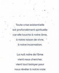 Ce passage intensément émotionnel, psychique, physique et spirituel, cette profonde crise existentielle, est en fait une poussée d’évolution. Elle nous amène à quitter qui nous avons été pour renaître.